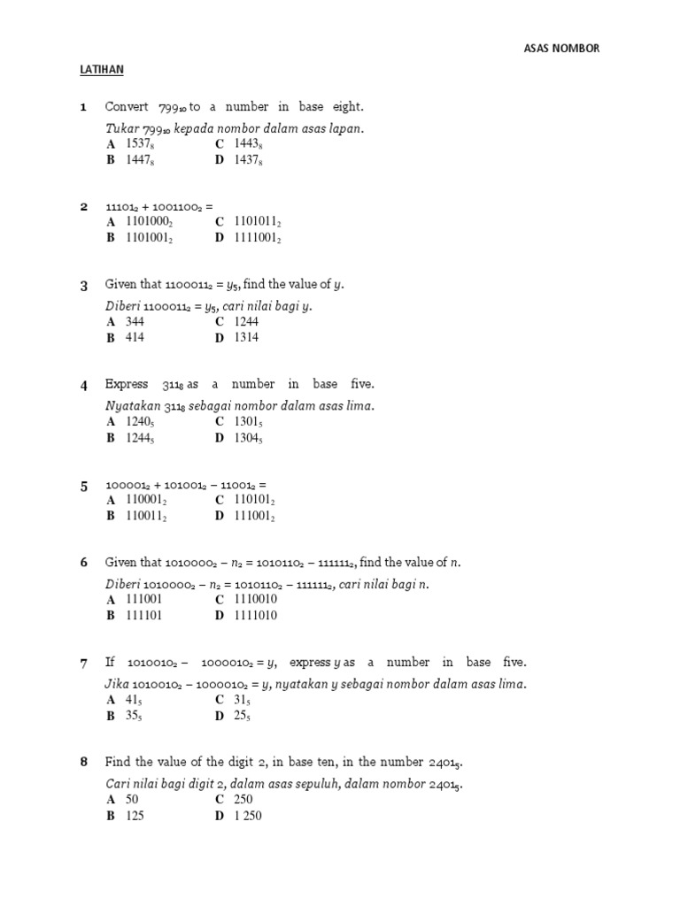 Bagaimanapun terdapat beberapa bukti sejarah yang cuba mengaitkan asal-usul bahasa Melayu seperti mana berikut. Sesuai untuk latih tubi matematik tahun 4. Nombor dalam Asas Dua Asas Lapan dan Asas Lima.