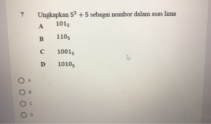 221 Asas Nombor SPM Praktis Kertas 1 Ungkapkan 2058 sebagai nombor dalam asas lima. A 10345 B 100345 C 103045 D 101345 5 Express 352 3 as a number in base five. 6 22 101111001 A 2100100 B 211011 C 2110010 D 2100110 7.