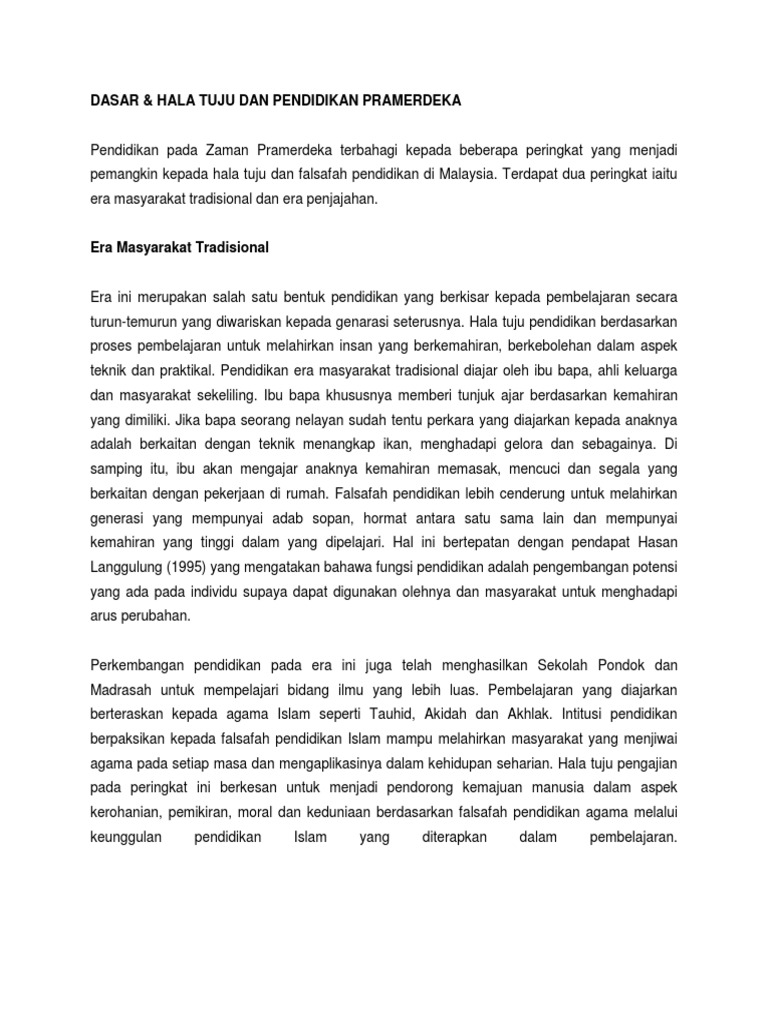 SEJARAH PERKEMBANGAN PENDIDIKAN DI MALAYSIA 1600 1990 Sejarah Awal Pendidikan di Tanah Melayu Corak pendidikan yang ada di waktu ini berbentuk bukan formal. Senarai Mata Pelajaran Sekolah Menengah KSSM Aliran Peralihan Perdana Dini Tahfiz Pendidikan Khas dan Sekolah Seni. Pendidikan Negara ini juga merupakan landasan kepada Dasar Pendidikan Kebangsaan.